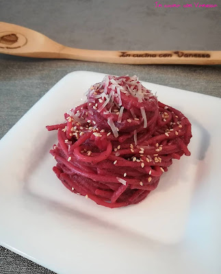 Spaghetti alla barbabietola con sesamo e scaglie di grana